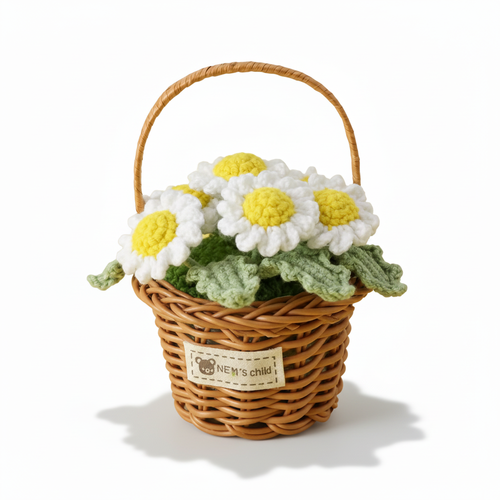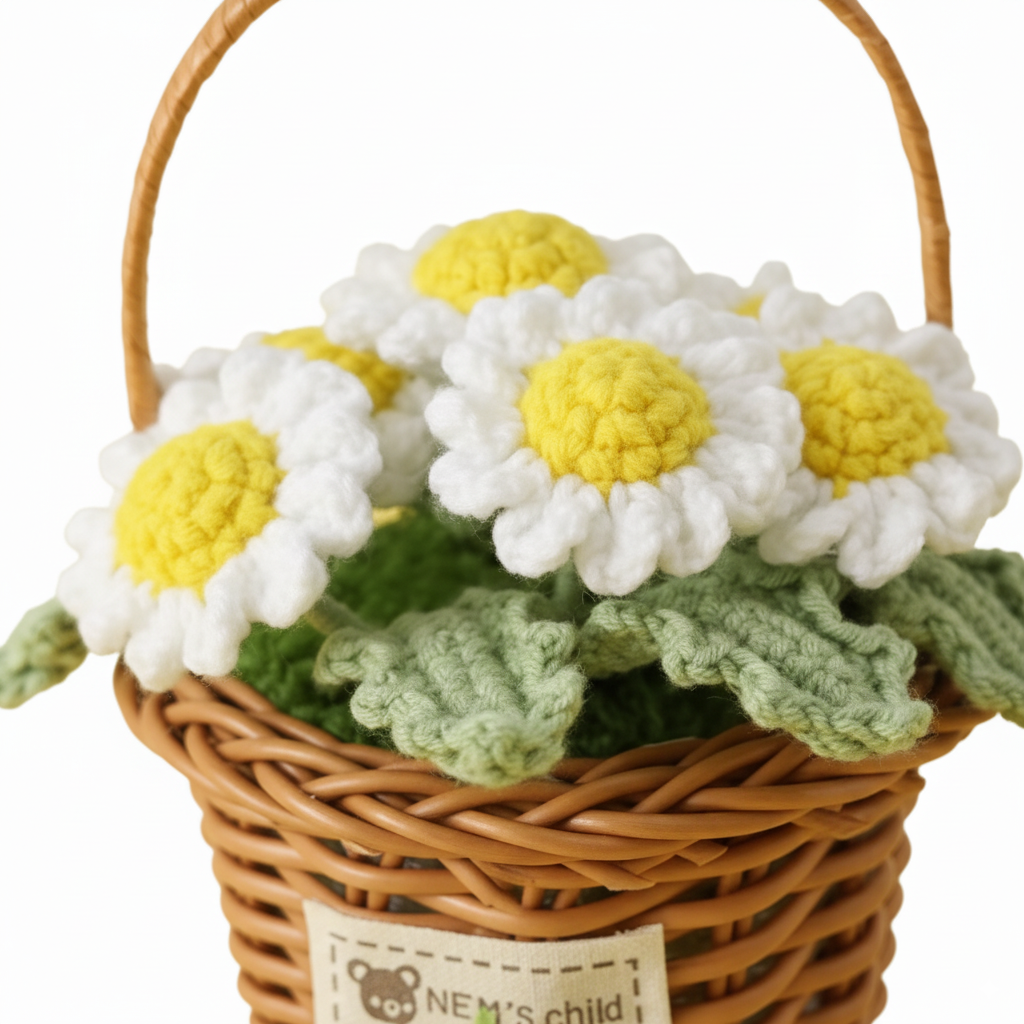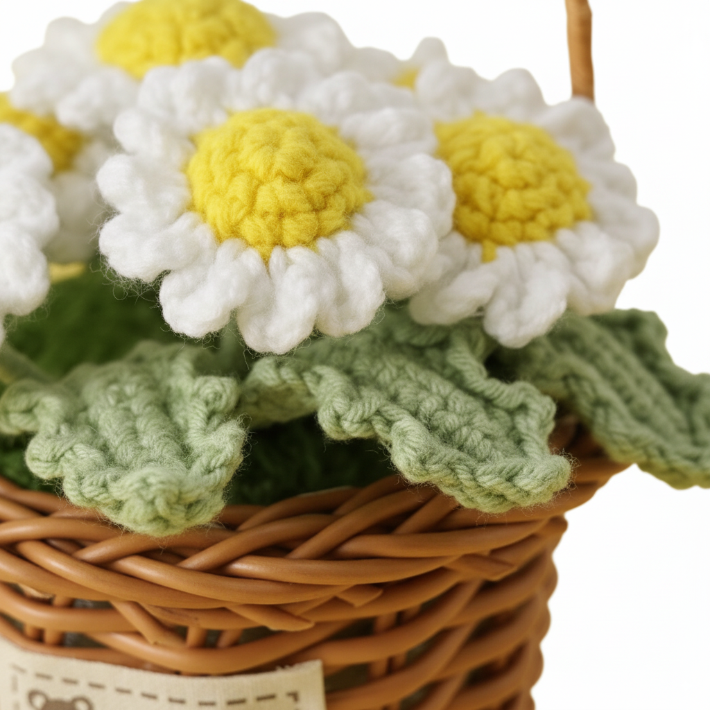 Handmade Crochet Daisy Flower Basket – Knitted Floral Home Decoration