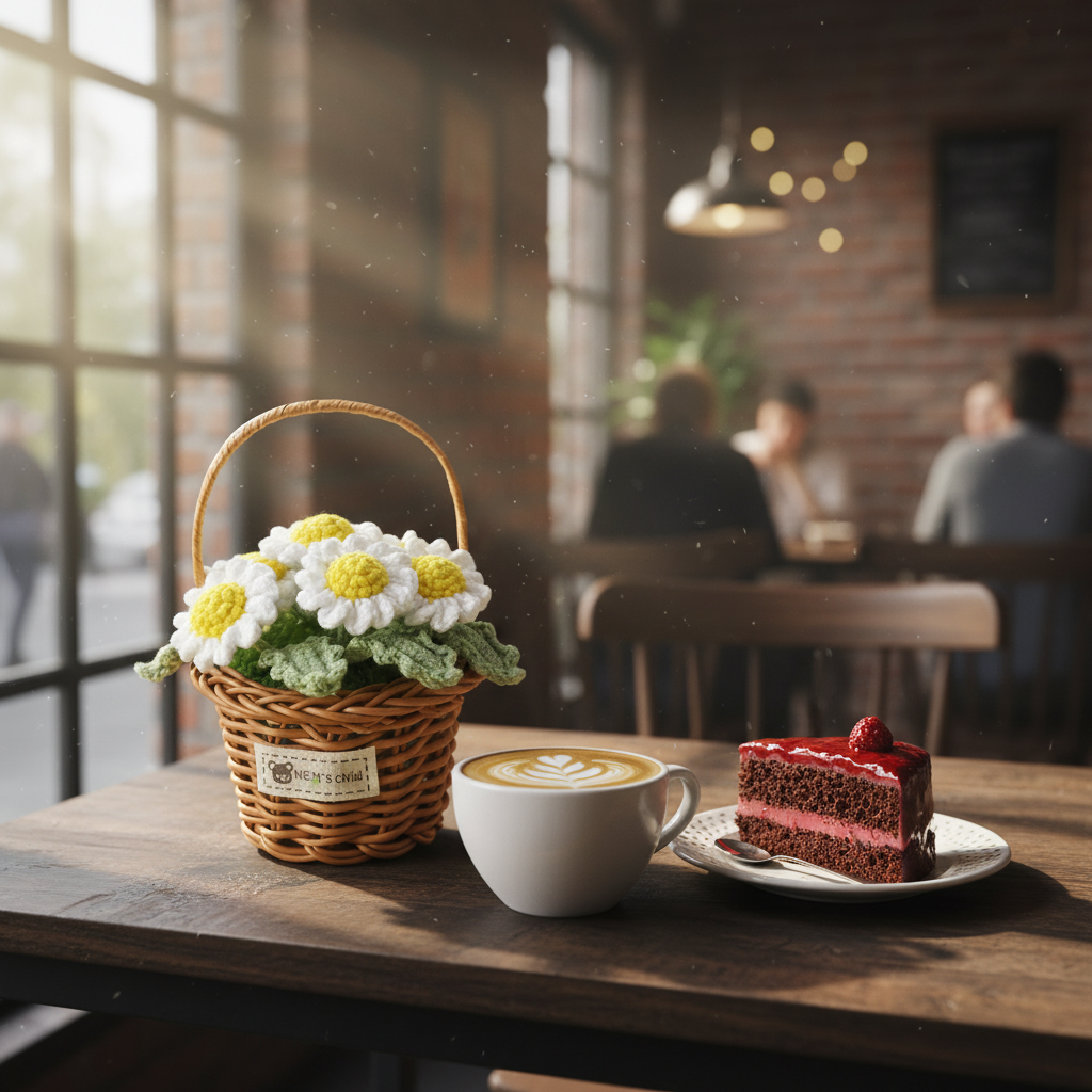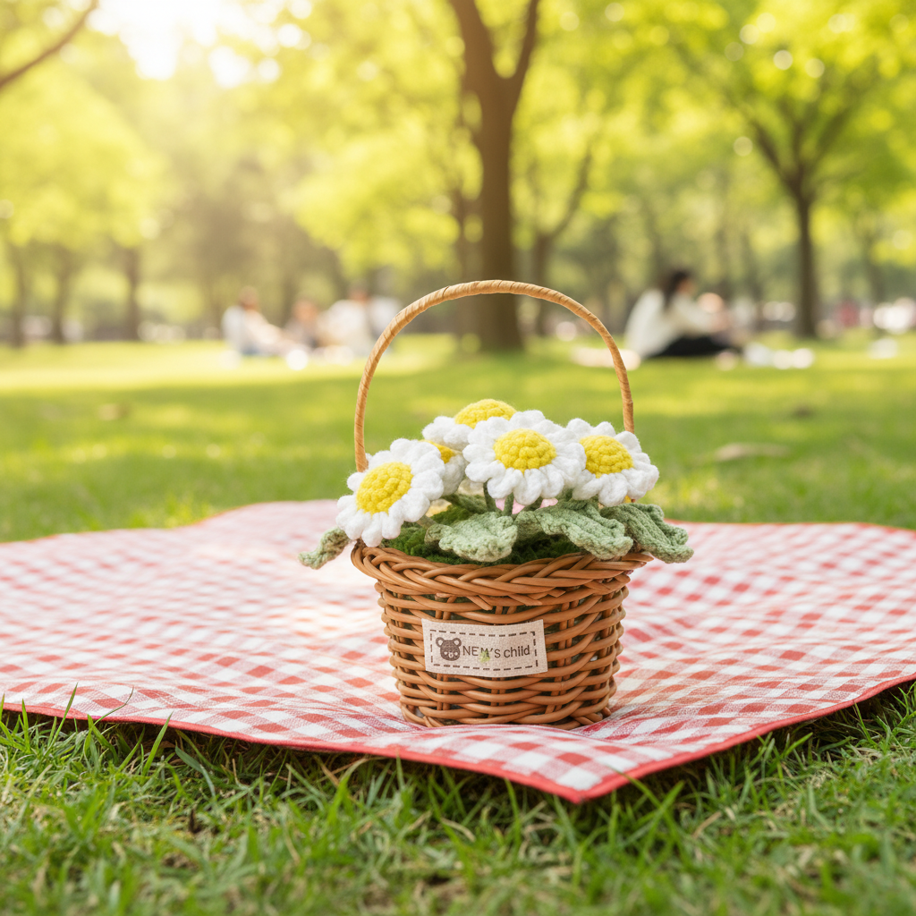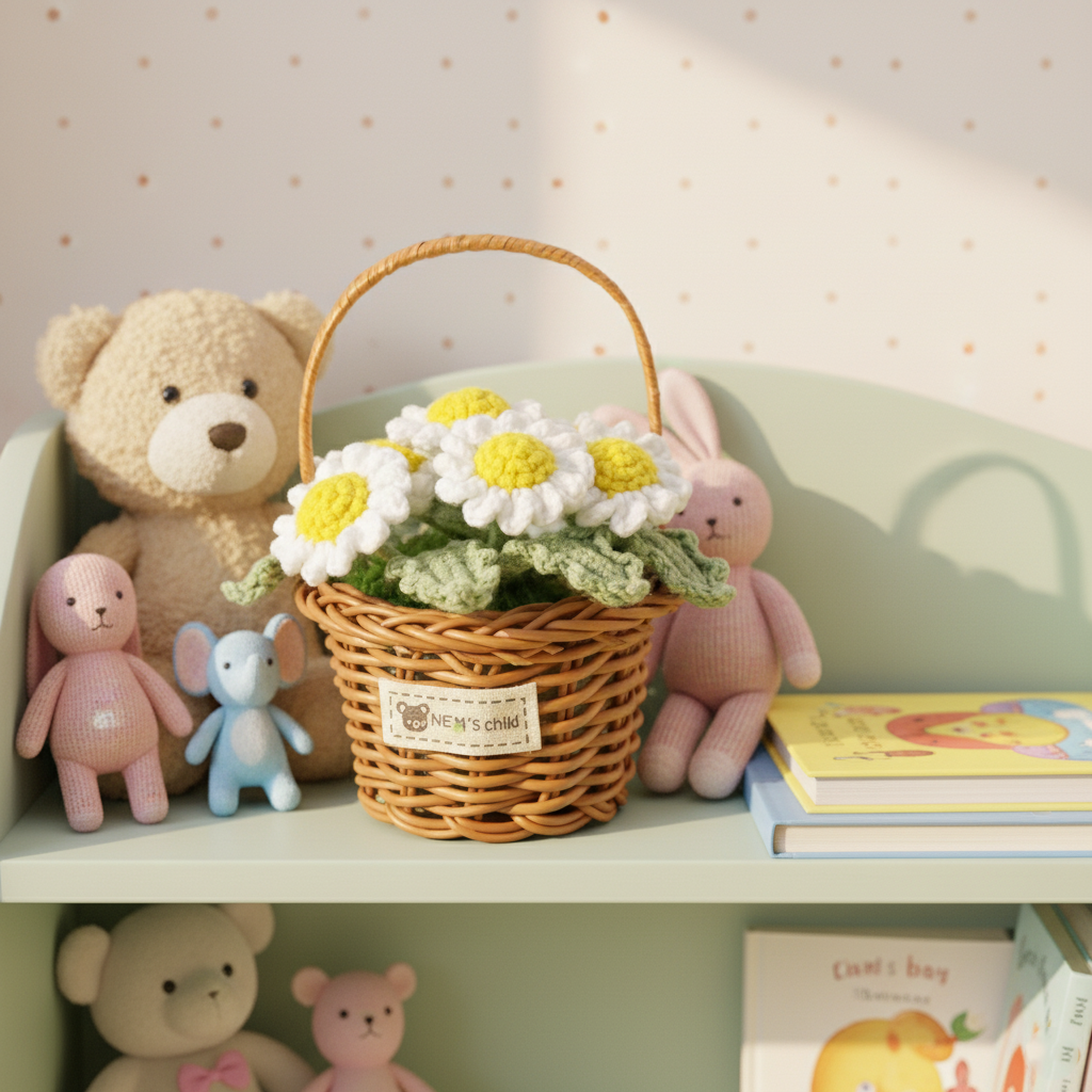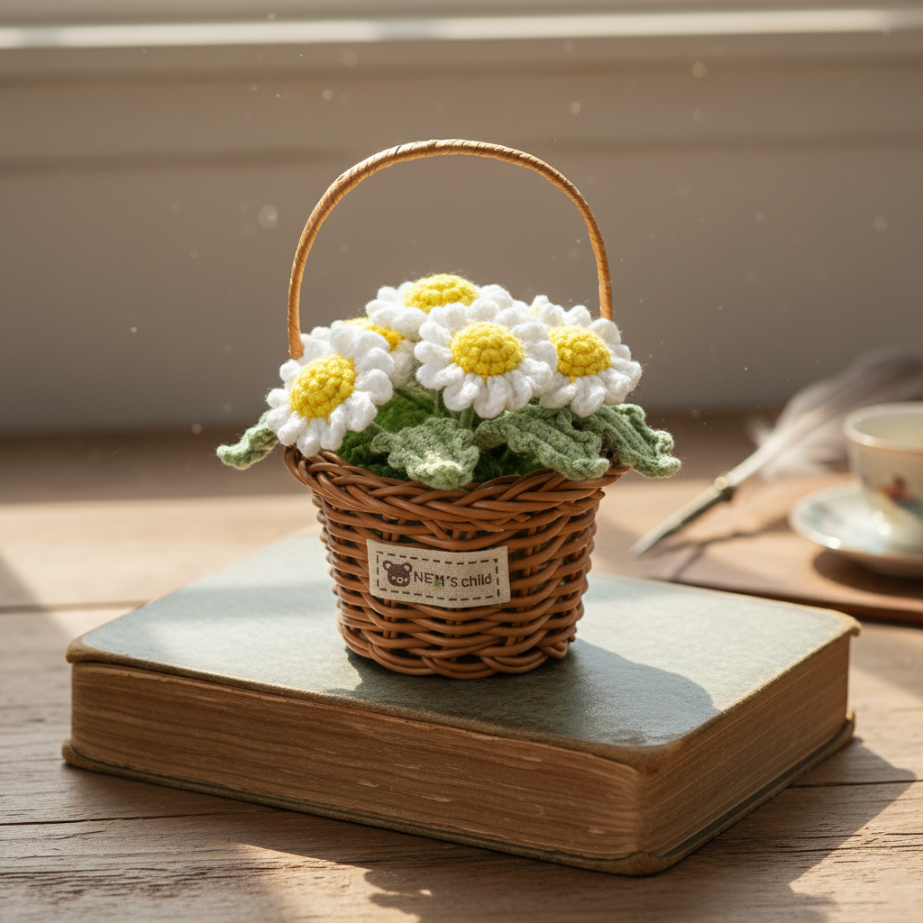 Handmade Crochet Daisy Flower Basket – Knitted Floral Home Decoration